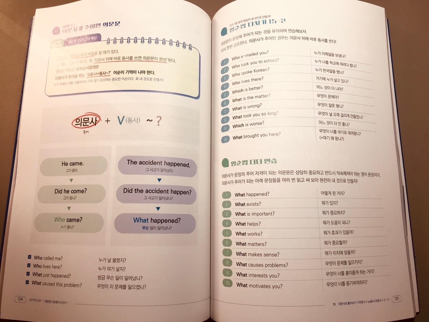 <영순법 기초영어 STEP 1>은 어쩌면 가장 원했던 책인지도 모른다. 진작에 이렇게 공부했어야 했다는 생각이 들 정도다. 우리가 언어, 말을 배우는 것인데 복잡한 수식을 풀어야 답을 얻을 수 있다는 듯 배웠고 평상시에 쓰지도 않을 어려운 단어를 주야장천 암기만 하고 실생활에선 거의 쓰지도 않았던 기억이 생생하다. 현지인들도 일상생활에서 쓰는 표현은 어렵지 않다고 한다. 필수 단어만 알고 있어도 의사소통하는데 무리가 없다는데 영어 잘하는 사람을 부러워만 할 것이 아니라 기초부터 차근차근 익혀야겠다. '영순법 다지기'와 '영순법 더더 연습'을 넣은 이유가 표현을 익히려면 여러 번 말하고 써봐야 내 것이 되기 때문이다. STEP 1에 이어 STEP 2까지 마스터한다면 얼마나 영어 실력이 성장해 있을지 기대가 된다.